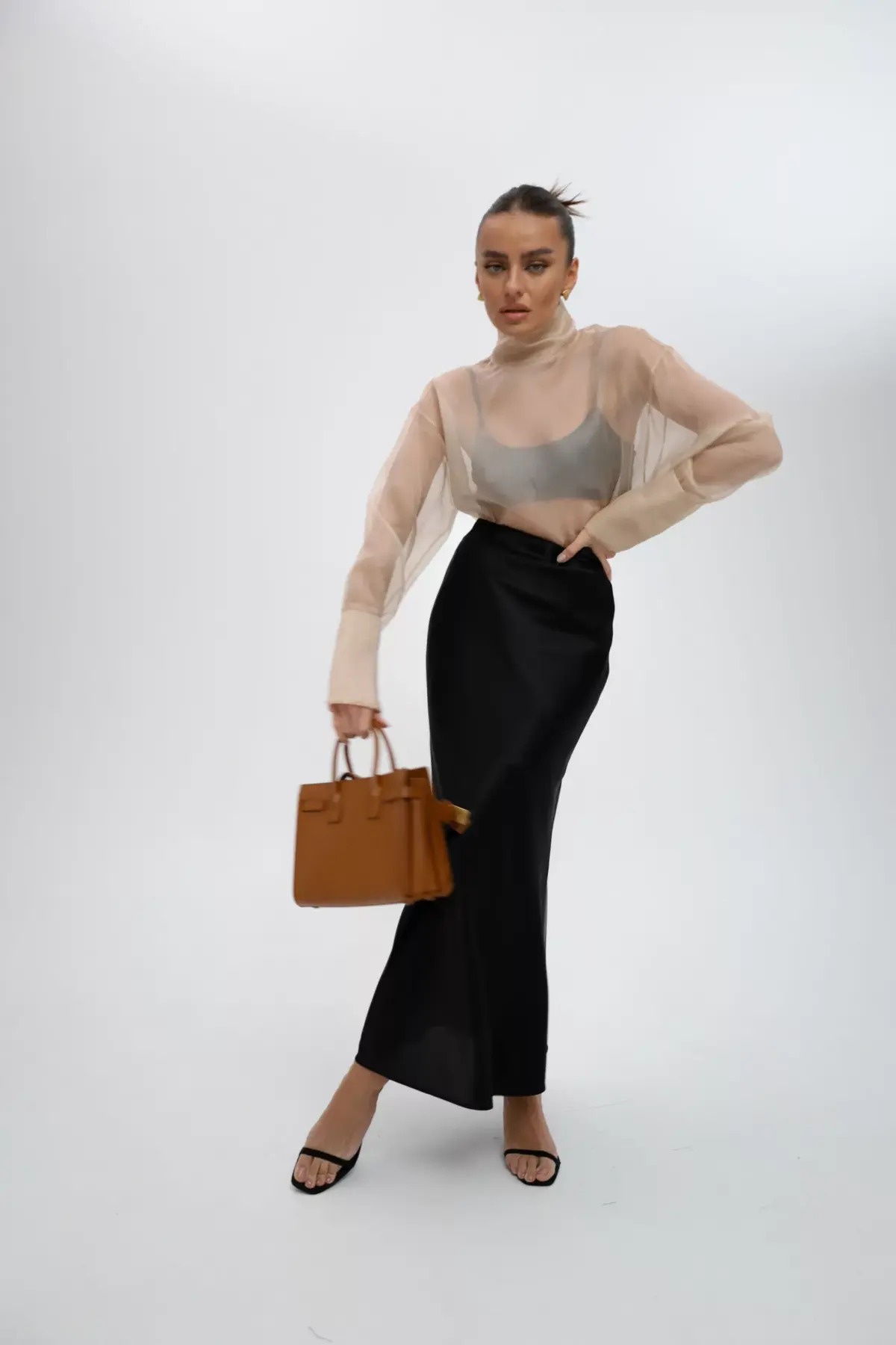 Цей чорний оверсайз-піджак поєднує в собі сучасну строгість і витончену мінімалістичну естетику. Виготовлений із щільної костюмної тканини з м’яким матовим блиском з акцентними деталями з органзи, він добре тримає форму та створює виразний силует. Подовжений крій і злегка занижена лінія плечей додають образу впевненості та легкої недбалості.