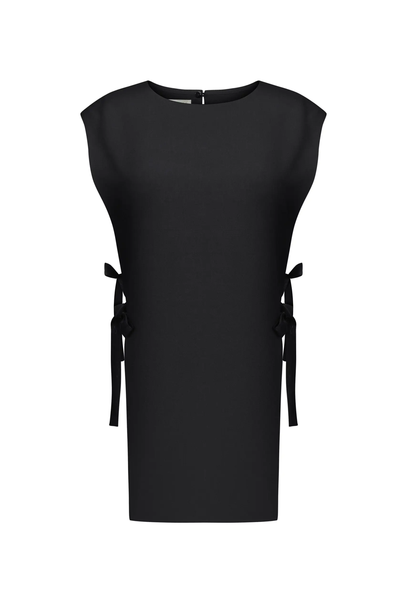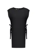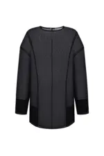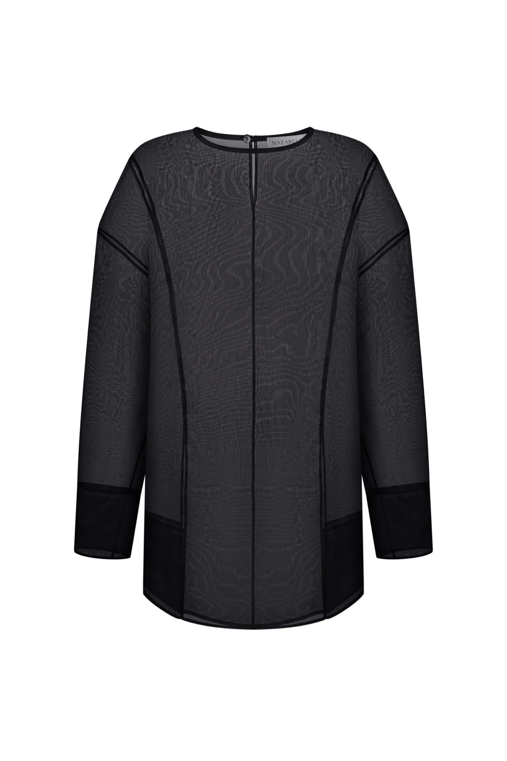 Блуза виконана в сучасному авангардному стилі й складається з двох шарів, що створюють складний, багатофактурний силует. Основою є напівпрозора чорна блуза з легкого сітчастого матеріалу. Вона має довгі рукави, які повністю зберігають прозорість і додають образу легкості та графічності. Через прозору тканину м’яко проглядаються контури фігури та тату, що підсилює ефект багатошаровості. Поверх цього шару розміщена щільніша чорна накладка-накидка, яку можна трактувати як асиметричний топ. Її стримана геометрія врівноважує етреальність прозорої тканини. У поєднанні ці два елементи формують елегантну, але водночас сміливу композицію—вишукану блузу з прозорими рукавами та боками, доповнену матовою накладкою, яка додає структурності й робить образ цілісним, стильним і виразним.
