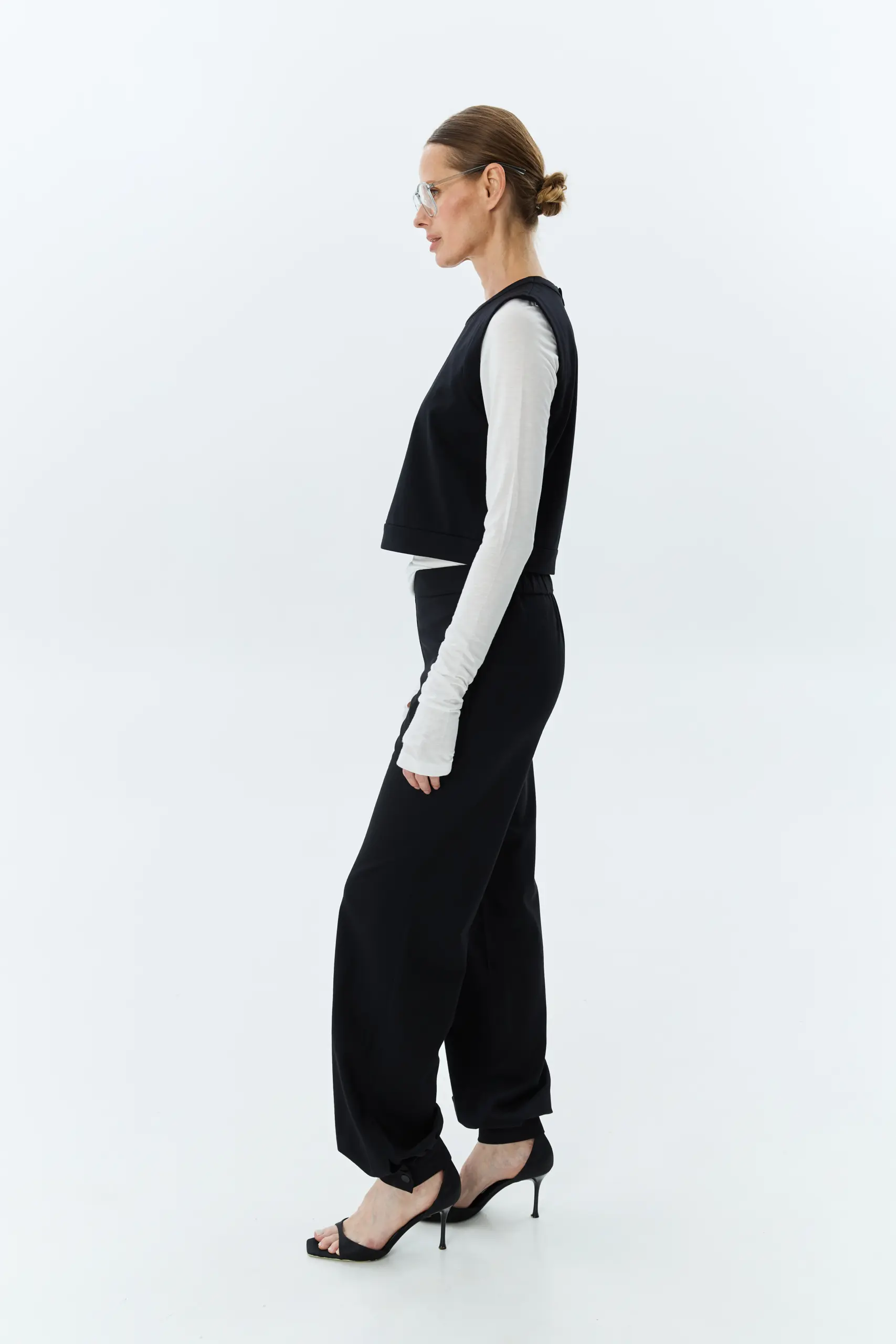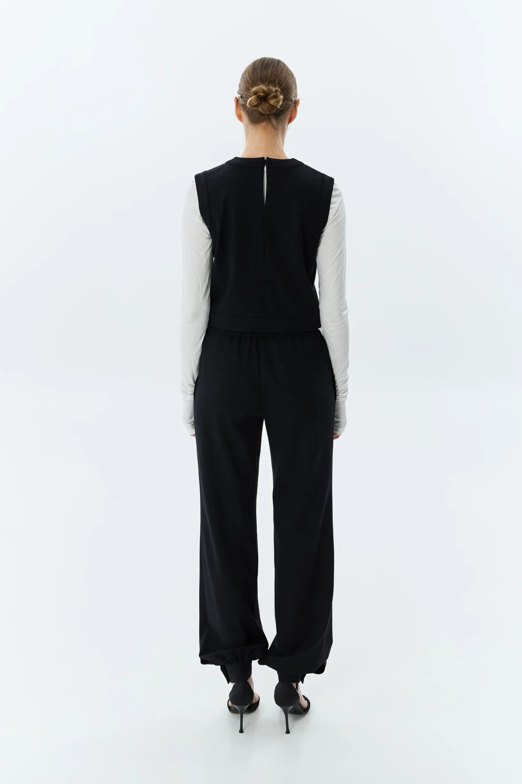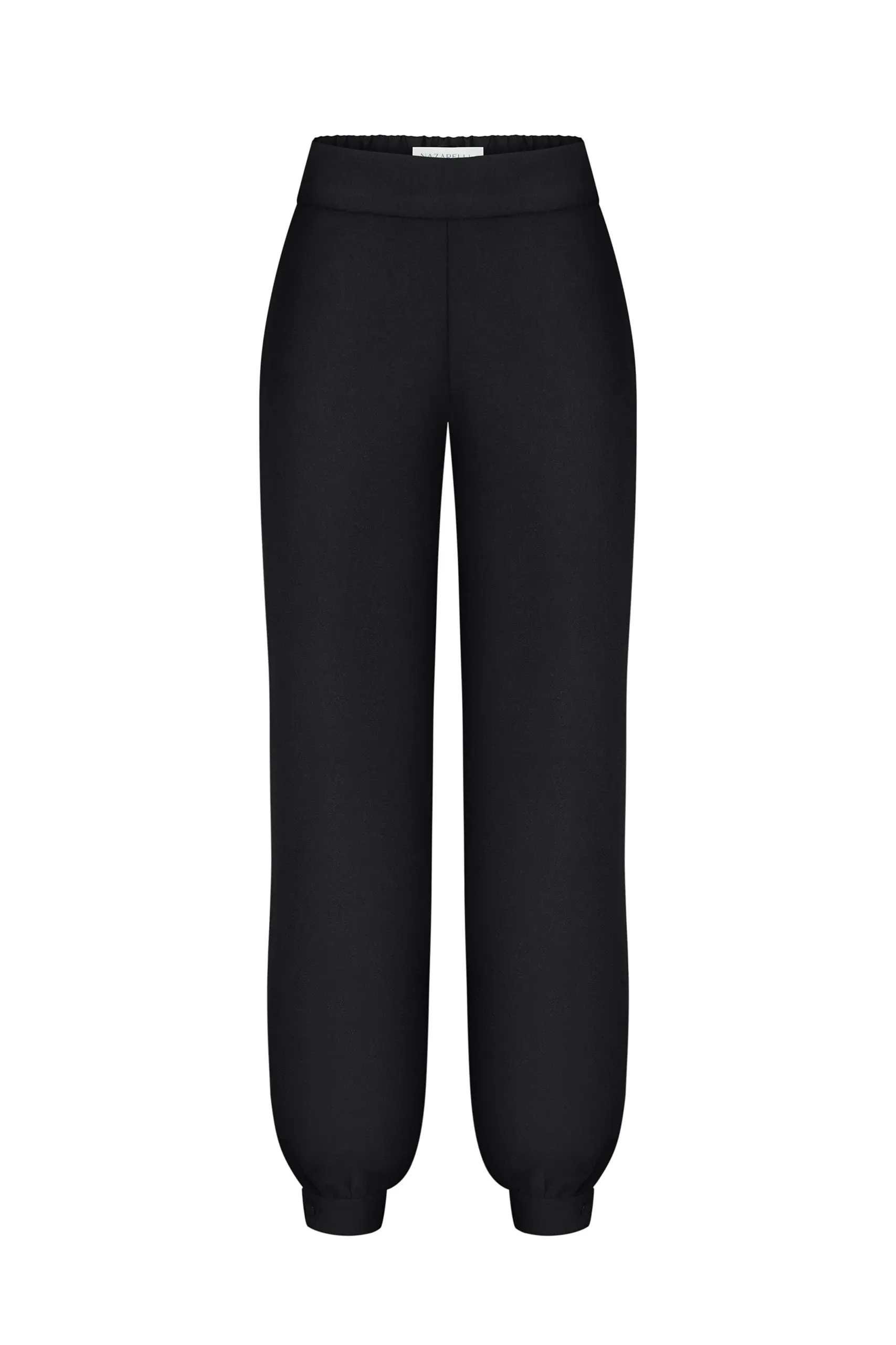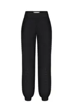 Комфортні та стильні брюки чорного кольору з еластичним поясом і манжетами знизу. Вільний крій забезпечує зручність рухів, а сучасний дизайн робить їх універсальним вибором для повсякденних образів. Легко поєднуються з топами, футболками, світшотами чи жакетами.