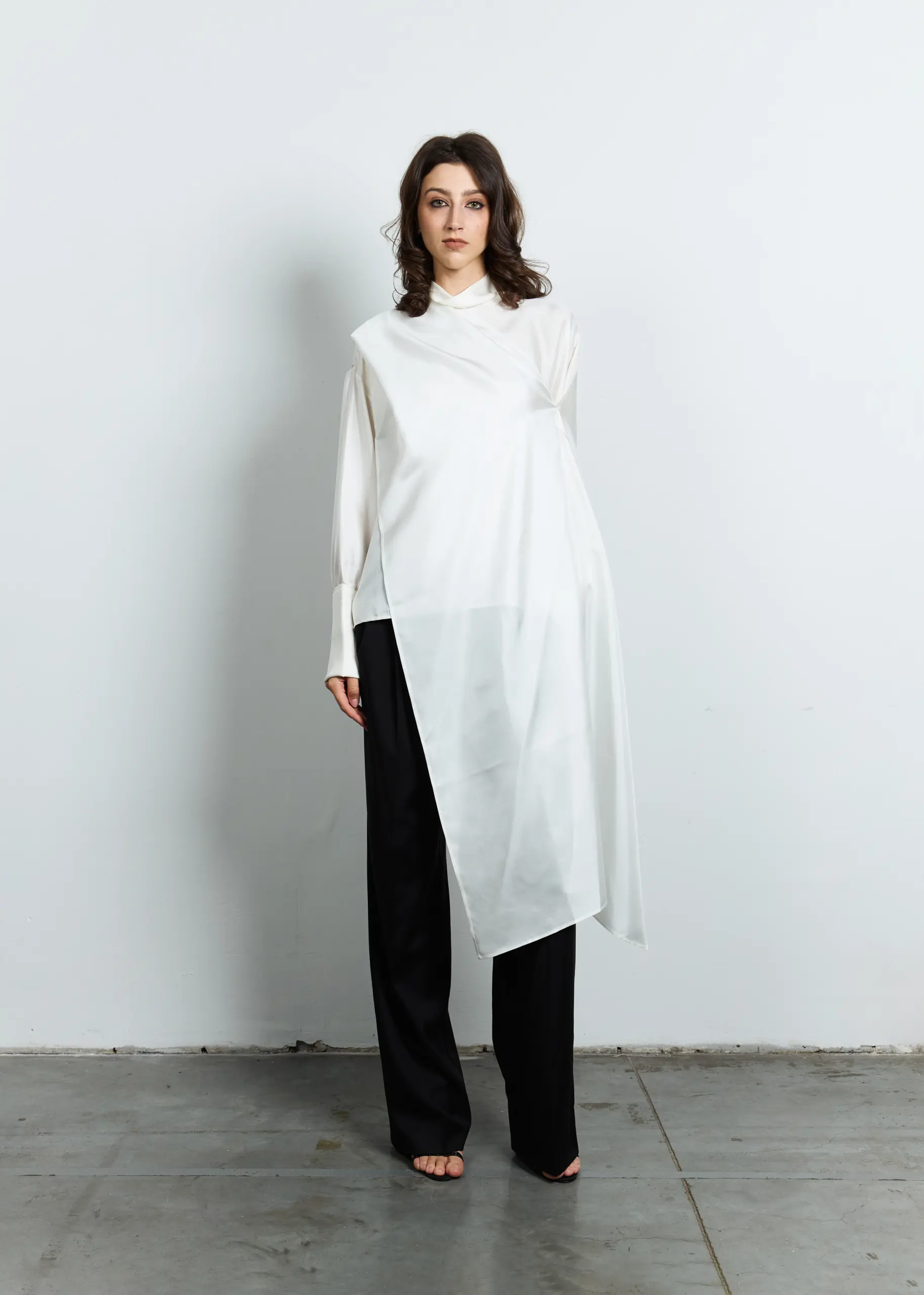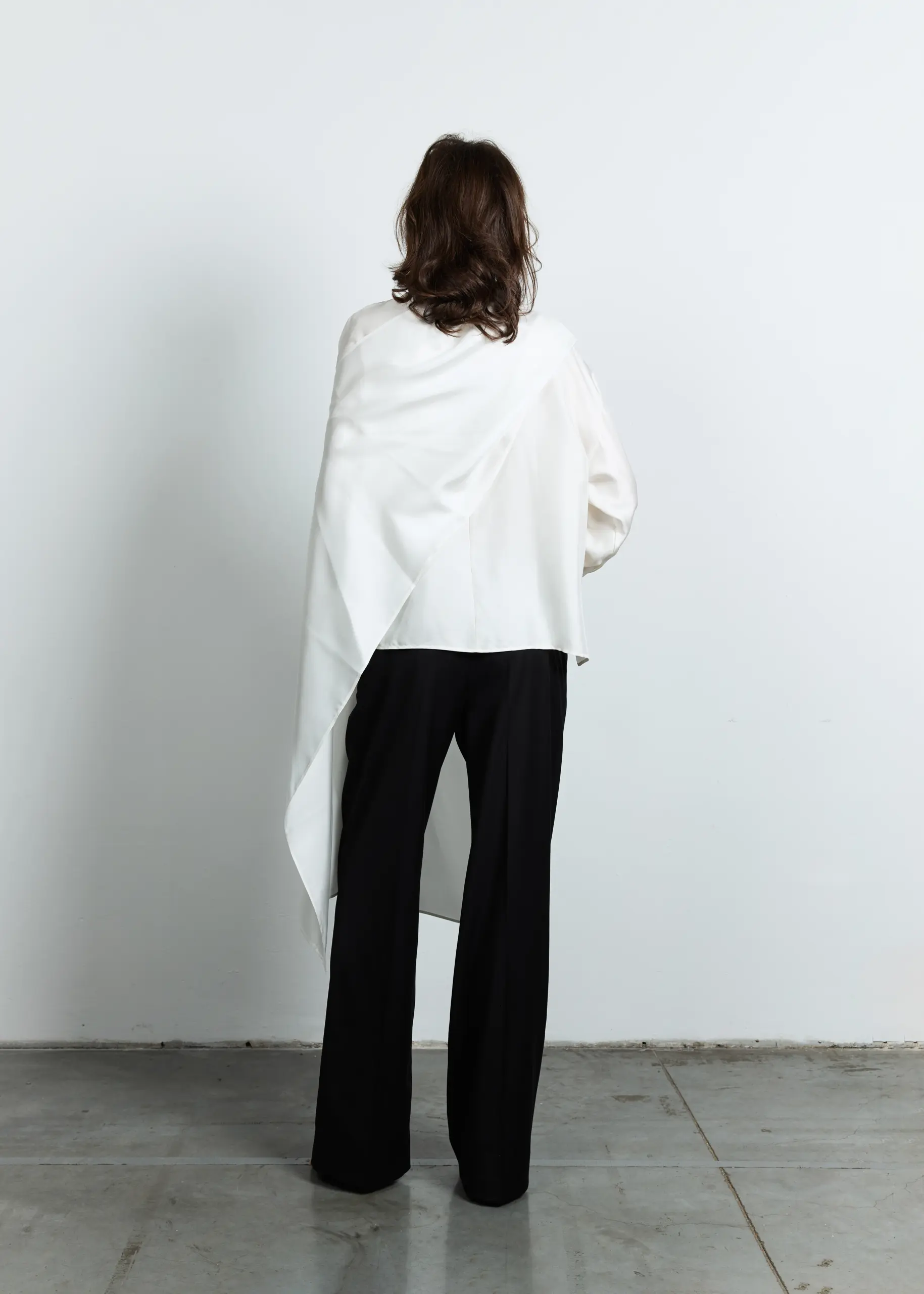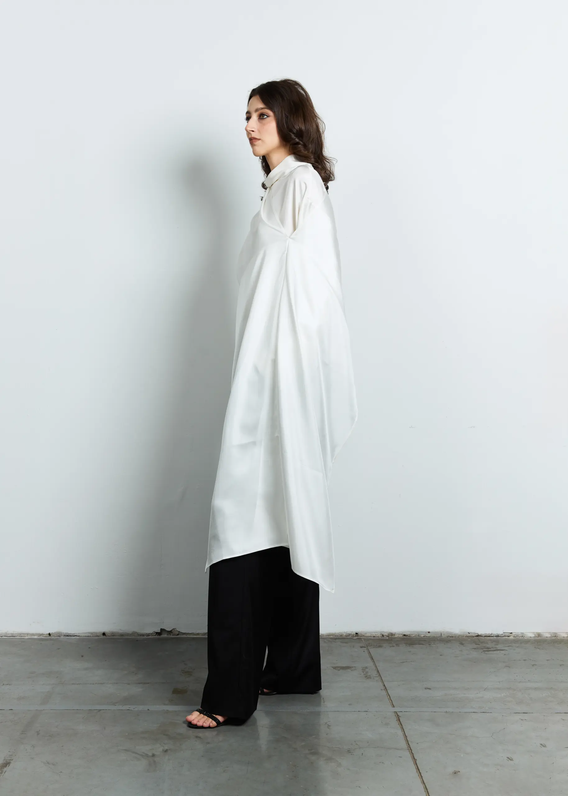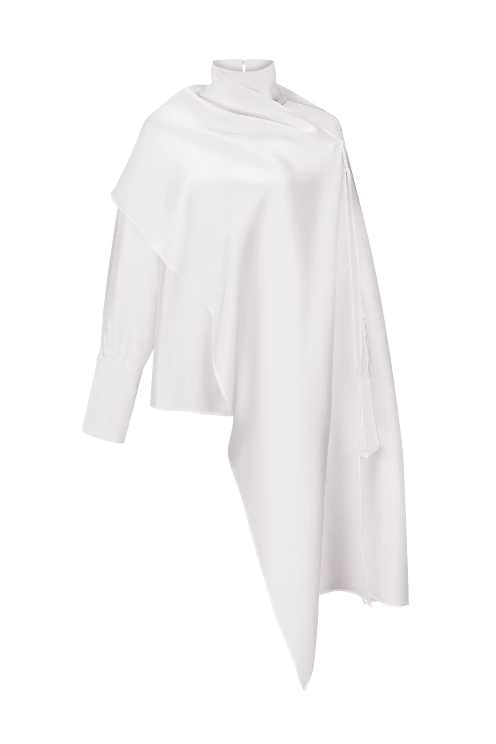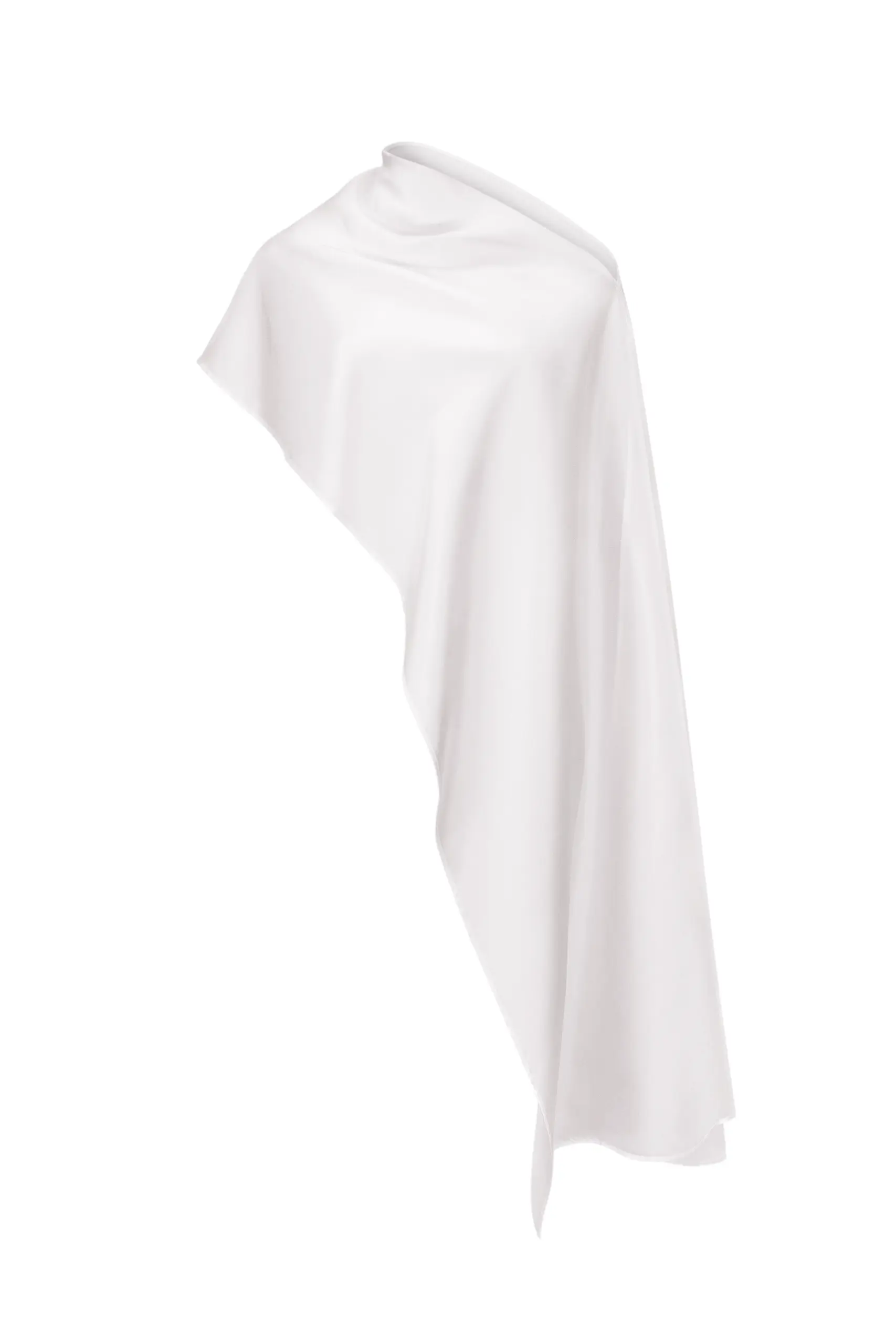 Ця біла накидка створена з легкої, м’яко струмливої тканини, що формує витончений асиметричний силует. Вона м’яко спадає уздовж тіла, додаючи образу повітряності, чистоти форм та сучасної архітектурності.