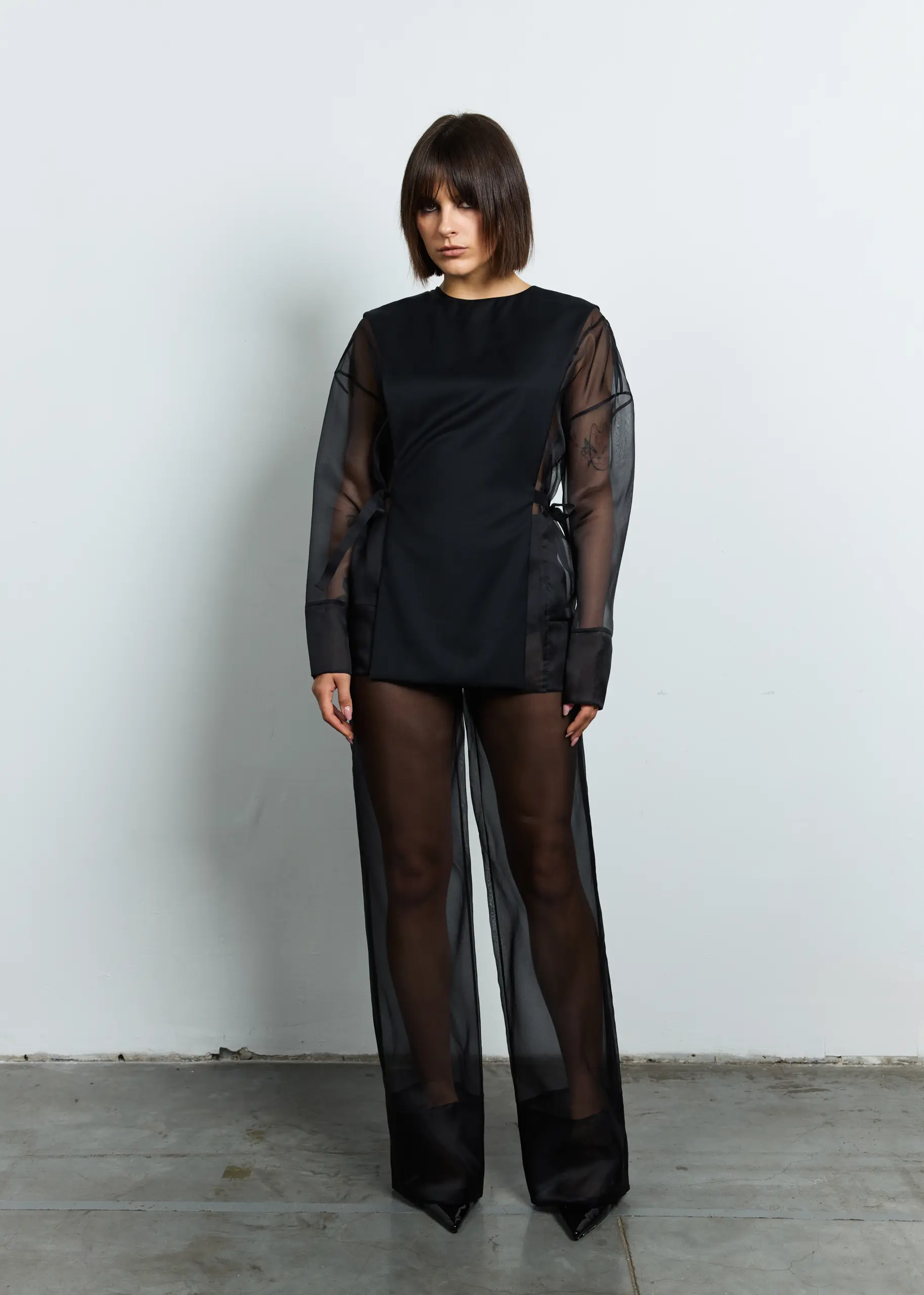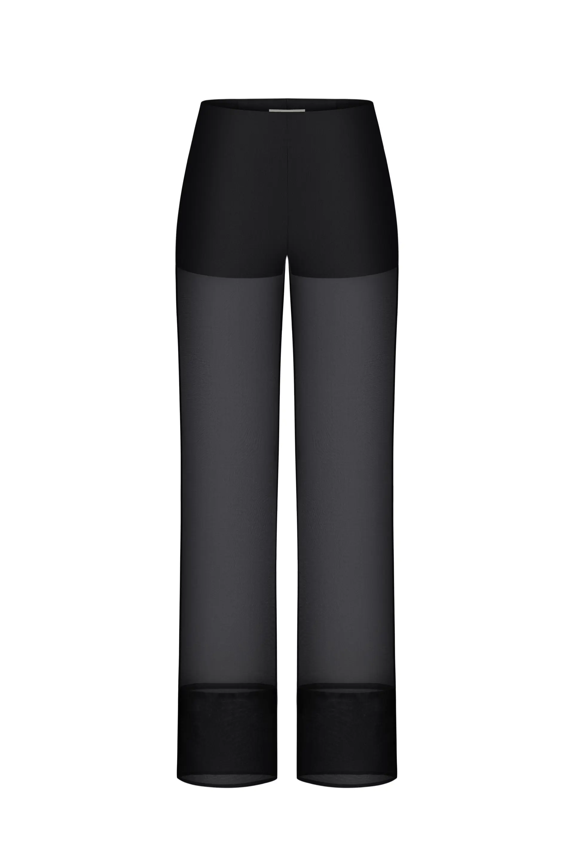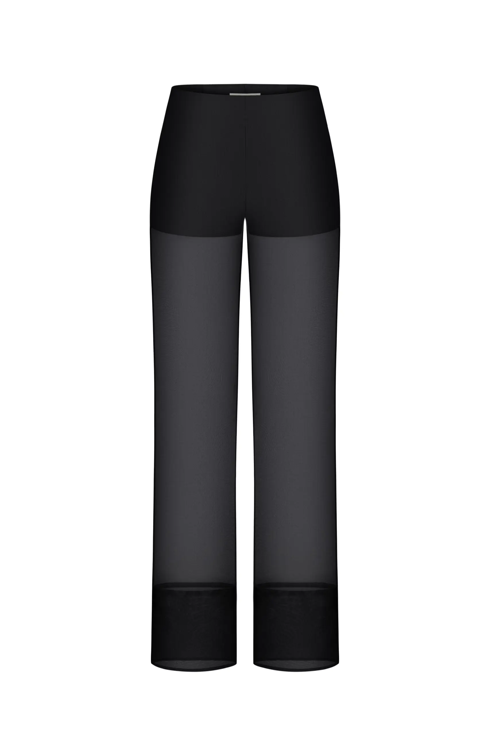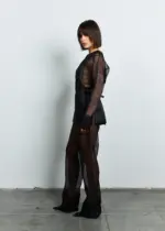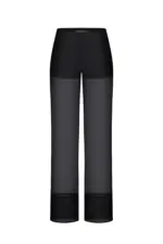 Палаццо прозорі — це ефектні, акцентні штани з напівпрозорої чорної тканини, які створюють легкий, повітряний силует. Модель має вільний, розширений крій, характерний для палаццо, що робить образ водночас елегантним і авангардним. Прозора тканина додає образу сміливості та драматичності, підкреслюючи лінії ніг і створюючи багатошарову, графічну структуру в поєднанні з непрозорими елементами вгорі. Це витончений, модний акцент, який ідеально працює в комплекті з асиметричними або структурними топами.