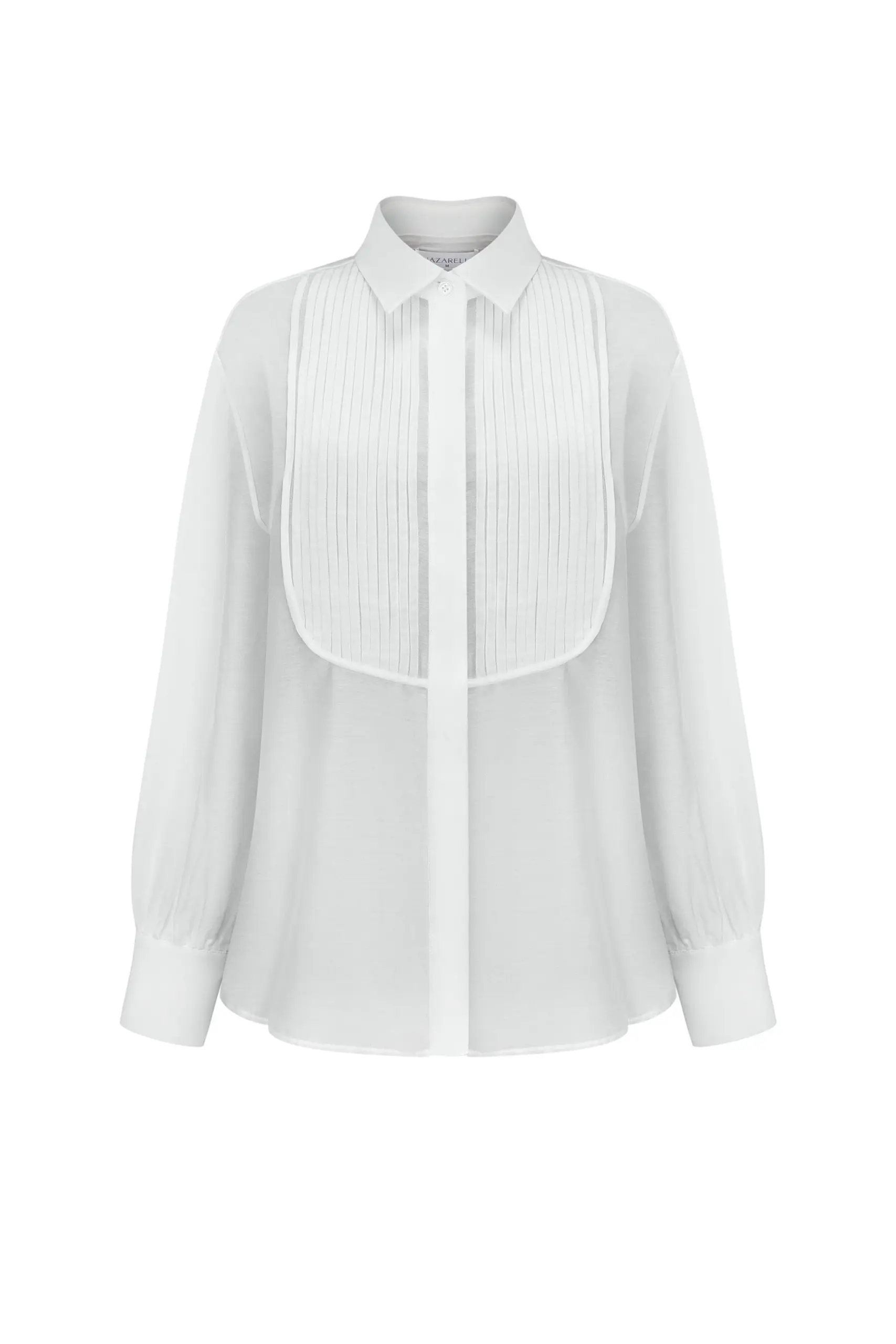 Витончена біла блуза з довгим рукавом та елегантним комірцем — стильне рішення як для офісу, так і для особливих випадків. Особливістю моделі є декоративна планка з вертикальними складками на грудях, що додає образу вишуканості. Легкий та дихаючий матеріал забезпечує комфорт упродовж дня, а прямий силует робить блузу універсальною для будь-якого типу фігури.