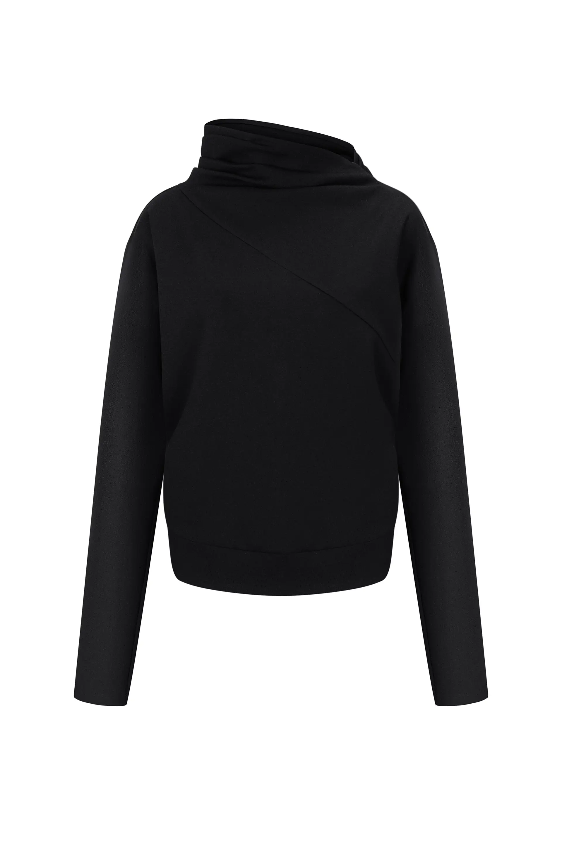 Стильний чорний топ з унікальним асиметричним коміром — ідеальний вибір для тих, хто цінує комфорт і хоче виглядати сучасно. Лаконічний дизайн із цікавими деталями додає образу індивідуальності, а приємна до тіла тканина забезпечує максимальний комфорт у щоденному носінні.